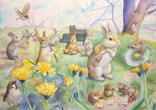 動物の音楽家たちが楽器を奏でます。